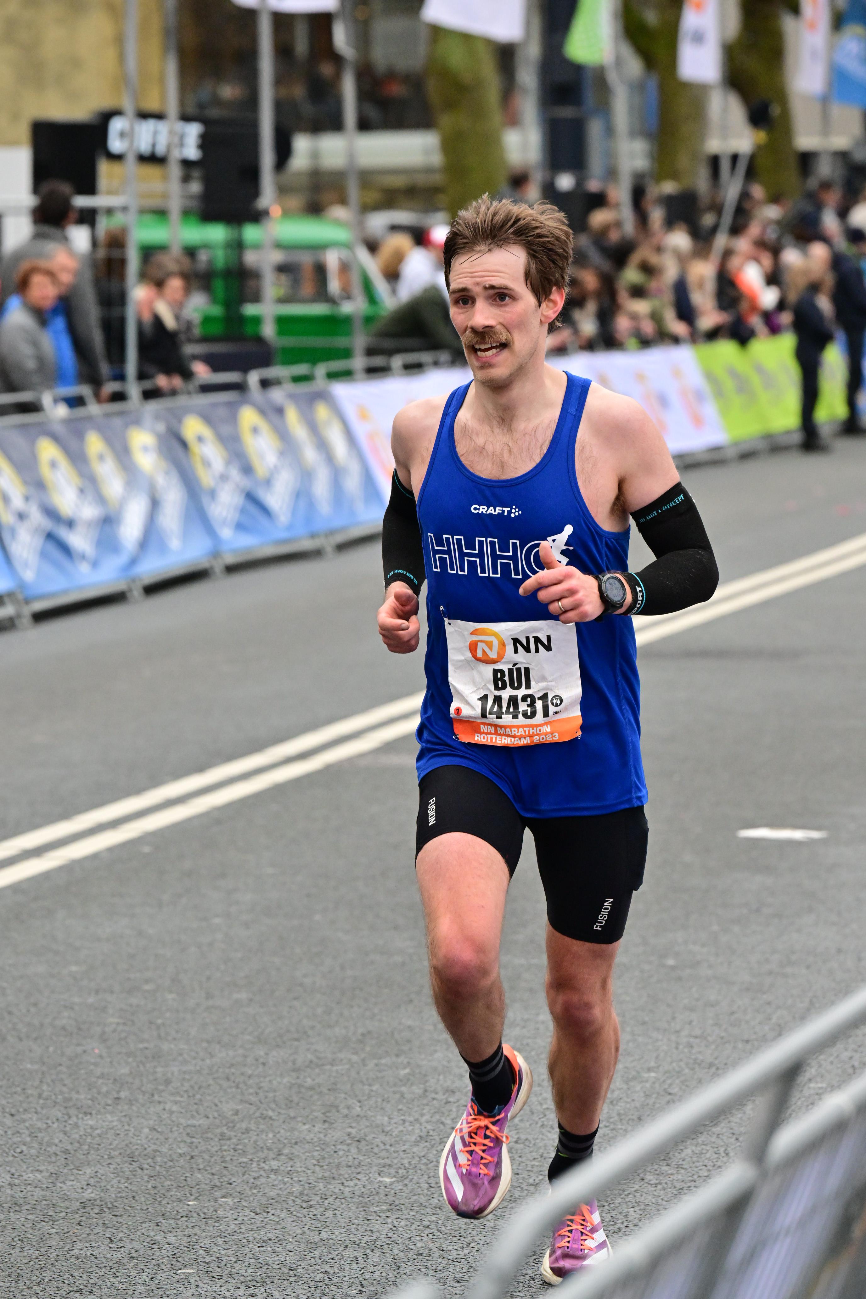 Hlaupadagurinn byrjaði frábærlega. Kári okkar gerði sér lítið fyrir og svaf í gegnum nóttina sem strax gaf fögur fyrirheit um framhaldið. Hafragrautur, kaffibolli og svo röltum við á lestarstöðina á Amsterdam, ég Elín og Kári eldri, faðir minn, sem hugðist hlaupa kvartmaraþon. Þegar til Rotterdam var komið hittum við Kristján Svan og hans hundtrygga aðstoðarmann og vin Gunnar og fórum fljótlega að olnboga okkur að startlínunni. Það var ekki tekið út með sældinni að komast framarlega í startið og fór það svo að við byrjuðum rétt fyrir aftan 3:00 blöðruna. Hlaupið ræst og við Kristján geystumst af stað. Missterkir hlauparar sem planta sér þarna fremst, það er bara eins og það er.